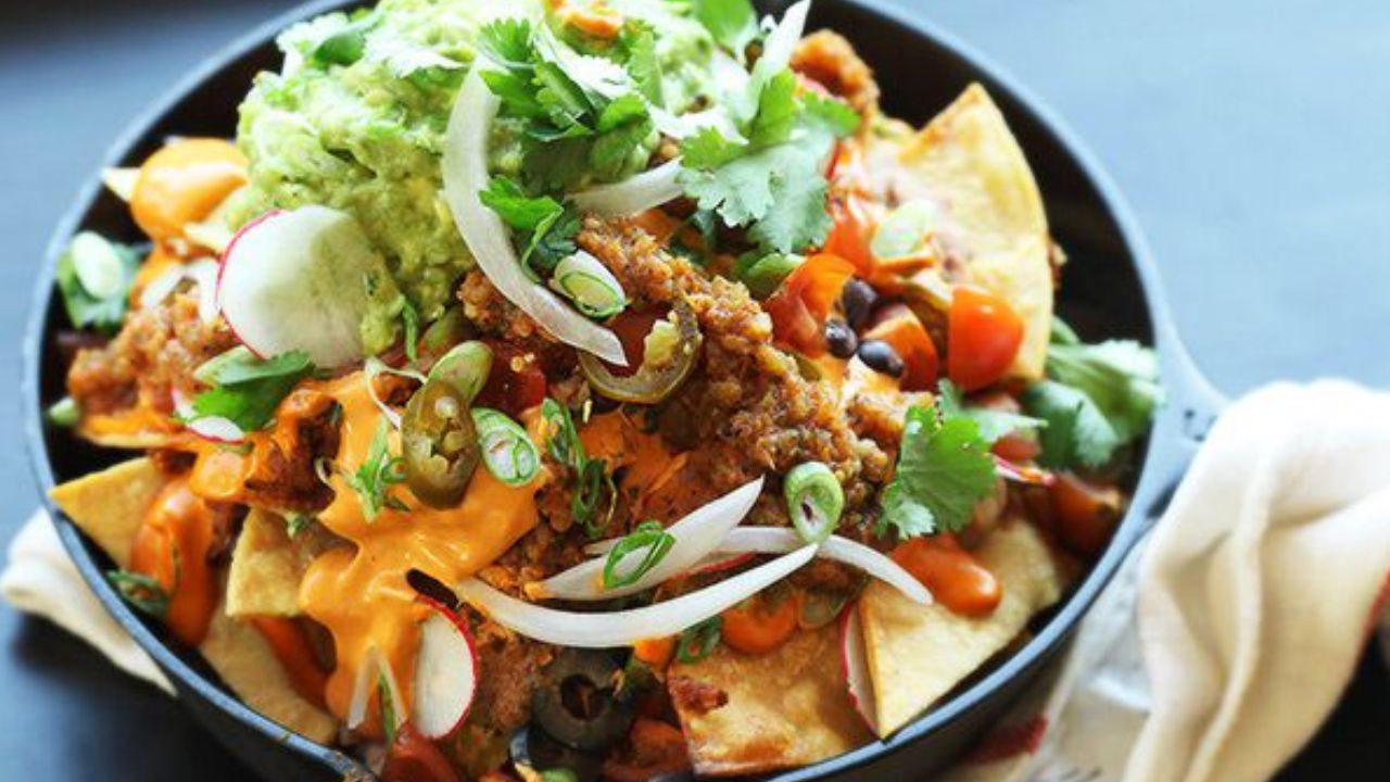 Beans and vegetables add color, texture, and nutritional value to nachos.